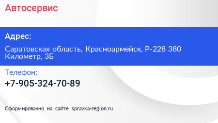 Автосервис по адресу Саратовская область, Красноармейск, Р-228 380 Километр, 3Б в дальнейшем Организация, размещена в следующих категориях: