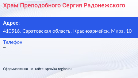 Храм Преподобного Сергия Радонежского по адресу 410516, Саратовская область, Красноармейск, Мира, 10 в дальнейшем Организация, размещена в следующих категориях:
