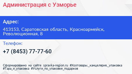 Администрация, с. Узморье по адресу 413153, Саратовская область, Красноармейск, Революционная, 8 в дальнейшем Организация, размещена в следующих категориях: