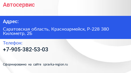 Автосервис по адресу Саратовская область, Красноармейск, Р-228 380 Километр, 2Б в дальнейшем Организация, размещена в следующих категориях: