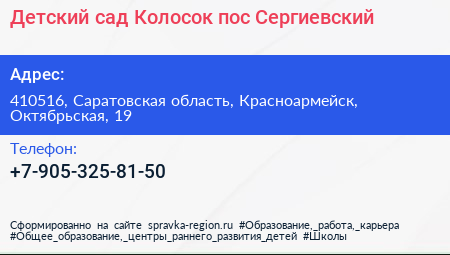 Детский сад Колосок, пос. Сергиевский по адресу 410516, Саратовская область, Красноармейск, Октябрьская, 19 в дальнейшем Организация, размещена в следующих категориях: