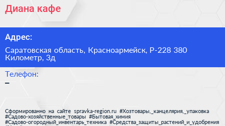 Диана, кафе по адресу Саратовская область, Красноармейск, Р-228 380 Километр, 3д в дальнейшем Организация, размещена в следующих категориях: