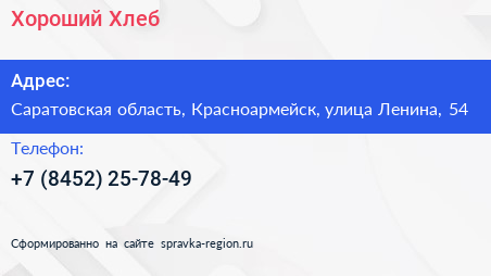 Хороший Хлеб по адресу Саратовская область, Красноармейск, улица Ленина, 54 в дальнейшем Организация, размещена в следующих категориях: