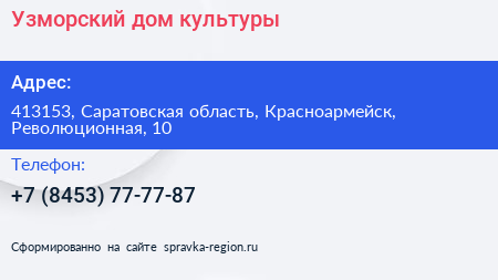 Узморский, дом культуры по адресу 413153, Саратовская область, Красноармейск, Революционная, 10 в дальнейшем Организация, размещена в следующих категориях: