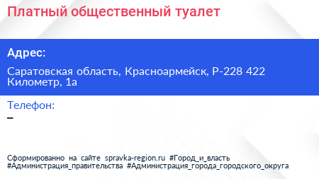 Платный общественный туалет по адресу Саратовская область, Красноармейск, Р-228 422 Километр, 1а в дальнейшем Организация, размещена в следующих категориях: