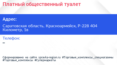 Платный общественный туалет по адресу Саратовская область, Красноармейск, Р-228 404 Километр, 1в в дальнейшем Организация, размещена в следующих категориях: