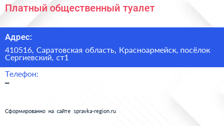 Платный общественный туалет по адресу 410516, Саратовская область, Красноармейск, посёлок Сергиевский, ст1 в дальнейшем Организация, размещена в следующих категориях: