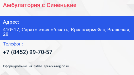 Амбулатория, с. Синенькие по адресу 410517, Саратовская область, Красноармейск, Волжская, 28 в дальнейшем Организация, размещена в следующих категориях:
