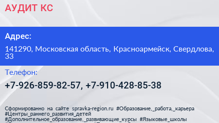 АУДИТ.КС по адресу 141290, Московская область, Красноармейск, Свердлова, 33 в дальнейшем Организация, размещена в следующих категориях: