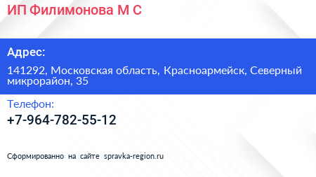 ИП Филимонова М.С. по адресу 141292, Московская область, Красноармейск, Северный микрорайон, 35 в дальнейшем Организация, размещена в следующих категориях: