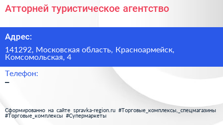 Атторней, туристическое агентство по адресу 141292, Московская область, Красноармейск, Комсомольская, 4 в дальнейшем Организация, размещена в следующих категориях: