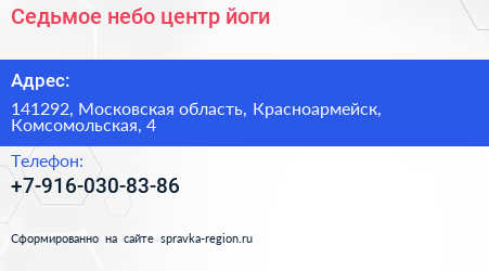 Седьмое небо, центр йоги по адресу 141292, Московская область, Красноармейск, Комсомольская, 4 в дальнейшем Организация, размещена в следующих категориях:
