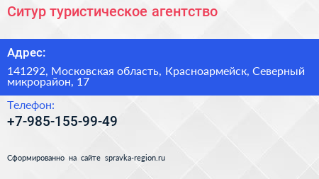Ситур, туристическое агентство по адресу 141292, Московская область, Красноармейск, Северный микрорайон, 17 в дальнейшем Организация, размещена в следующих категориях: