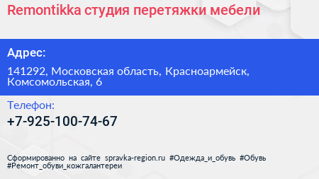 Remontikka, студия перетяжки мебели по адресу 141292, Московская область, Красноармейск, Комсомольская, 6 в дальнейшем Организация, размещена в следующих категориях: