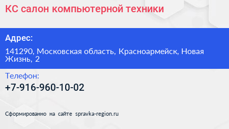 КС, салон компьютерной техники по адресу 141290, Московская область, Красноармейск, Новая Жизнь, 2 в дальнейшем Организация, размещена в следующих категориях: