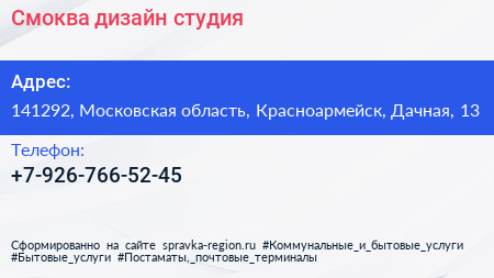 Смоква, дизайн-студия по адресу 141292, Московская область, Красноармейск, Дачная, 13 в дальнейшем Организация, размещена в следующих категориях: