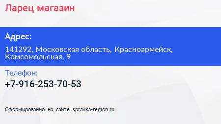 Ларец, магазин по адресу 141292, Московская область, Красноармейск, Комсомольская, 9 в дальнейшем Организация, размещена в следующих категориях: