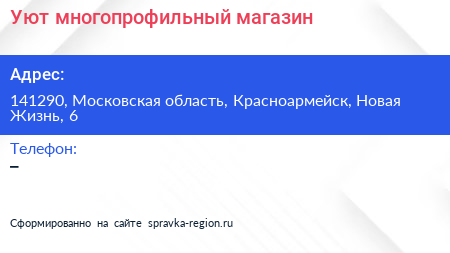 Уют, многопрофильный магазин по адресу 141290, Московская область, Красноармейск, Новая Жизнь, 6 в дальнейшем Организация, размещена в следующих категориях: