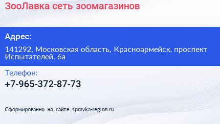 ЗооЛавка, сеть зоомагазинов по адресу 141292, Московская область, Красноармейск, проспект Испытателей, 6а в дальнейшем Организация, размещена в следующих категориях: