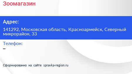Зоомагазин по адресу 141292, Московская область, Красноармейск, Северный микрорайон, 33 в дальнейшем Организация, размещена в следующих категориях: