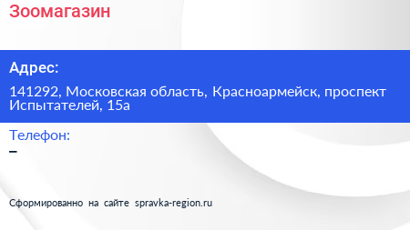 Зоомагазин по адресу 141292, Московская область, Красноармейск, проспект Испытателей, 15а в дальнейшем Организация, размещена в следующих категориях: