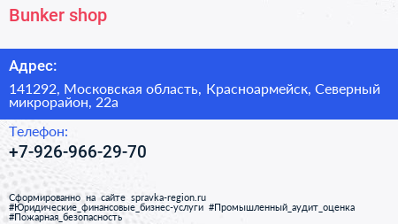 Bunker shop по адресу 141292, Московская область, Красноармейск, Северный микрорайон, 22а в дальнейшем Организация, размещена в следующих категориях: