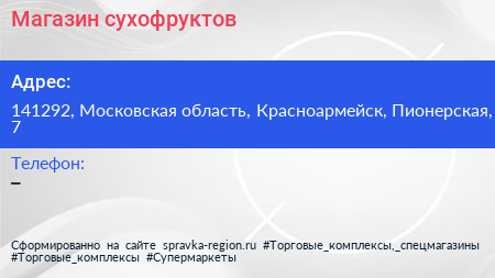 Магазин сухофруктов по адресу 141292, Московская область, Красноармейск, Пионерская, 7 в дальнейшем Организация, размещена в следующих категориях: