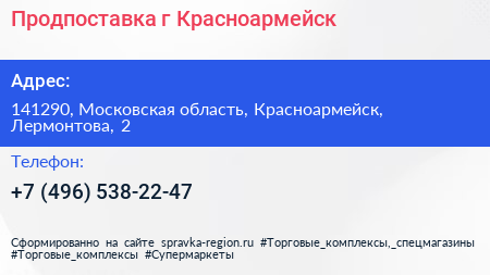 Продпоставка, г. Красноармейск по адресу 141290, Московская область, Красноармейск, Лермонтова, 2 в дальнейшем Организация, размещена в следующих категориях: