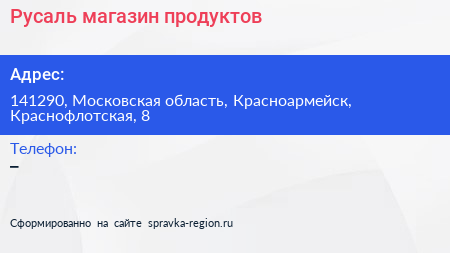 Русаль, магазин продуктов по адресу 141290, Московская область, Красноармейск, Краснофлотская, 8 в дальнейшем Организация, размещена в следующих категориях: