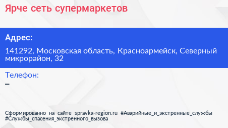 Ярче!, сеть супермаркетов по адресу 141292, Московская область, Красноармейск, Северный микрорайон, 32 в дальнейшем Организация, размещена в следующих категориях: