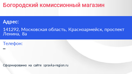Богородский, комиссионный магазин по адресу 141292, Московская область, Красноармейск, проспект Ленина, 8а в дальнейшем Организация, размещена в следующих категориях: