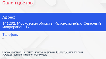 Салон цветов по адресу 141292, Московская область, Красноармейск, Северный микрорайон, 17 в дальнейшем Организация, размещена в следующих категориях: