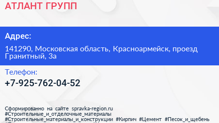АТЛАНТ ГРУПП по адресу 141290, Московская область, Красноармейск, проезд Гранитный, 3а в дальнейшем Организация, размещена в следующих категориях: