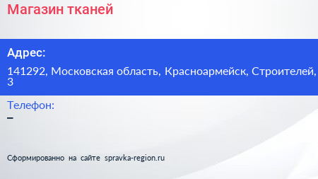 Магазин тканей по адресу 141292, Московская область, Красноармейск, Строителей, 3 в дальнейшем Организация, размещена в следующих категориях: