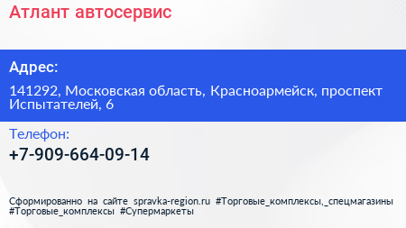 Атлант, автосервис по адресу 141292, Московская область, Красноармейск, проспект Испытателей, 6 в дальнейшем Организация, размещена в следующих категориях: