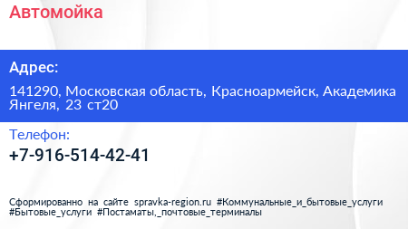 Автомойка по адресу 141290, Московская область, Красноармейск, Академика Янгеля, 23 ст20 в дальнейшем Организация, размещена в следующих категориях: