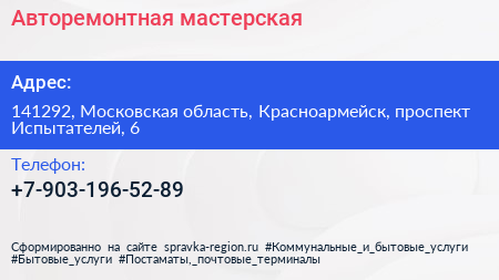 Авторемонтная мастерская по адресу 141292, Московская область, Красноармейск, проспект Испытателей, 6 в дальнейшем Организация, размещена в следующих категориях: