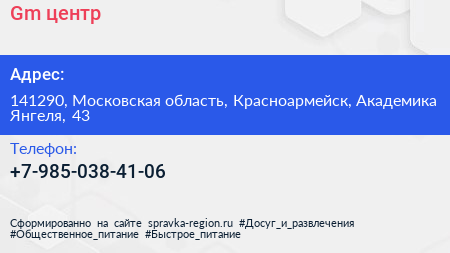 Gm, центр по адресу 141290, Московская область, Красноармейск, Академика Янгеля, 43 в дальнейшем Организация, размещена в следующих категориях: