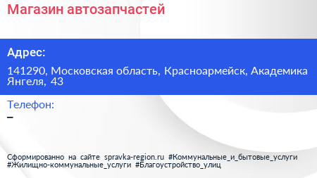 Магазин автозапчастей по адресу 141290, Московская область, Красноармейск, Академика Янгеля, 43 в дальнейшем Организация, размещена в следующих категориях: