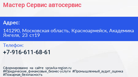 Мастер-Сервис, автосервис по адресу 141290, Московская область, Красноармейск, Академика Янгеля, 23 ст19 в дальнейшем Организация, размещена в следующих категориях: