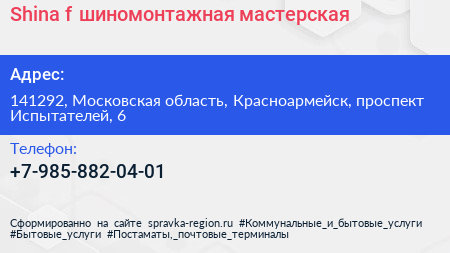 Shina-f, шиномонтажная мастерская по адресу 141292, Московская область, Красноармейск, проспект Испытателей, 6 в дальнейшем Организация, размещена в следующих категориях: