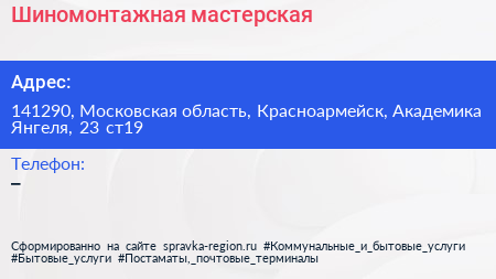 Шиномонтажная мастерская по адресу 141290, Московская область, Красноармейск, Академика Янгеля, 23 ст19 в дальнейшем Организация, размещена в следующих категориях: