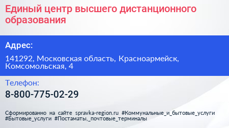 Единый центр высшего дистанционного образования по адресу 141292, Московская область, Красноармейск, Комсомольская, 4 в дальнейшем Организация, размещена в следующих категориях: