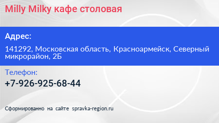 Milly Milky, кафе-столовая по адресу 141292, Московская область, Красноармейск, Северный микрорайон, 2Б в дальнейшем Организация, размещена в следующих категориях: