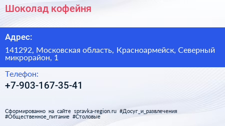 Шоколад, кофейня по адресу 141292, Московская область, Красноармейск, Северный микрорайон, 1 в дальнейшем Организация, размещена в следующих категориях: