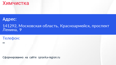 Химчистка по адресу 141292, Московская область, Красноармейск, проспект Ленина, 9 в дальнейшем Организация, размещена в следующих категориях: