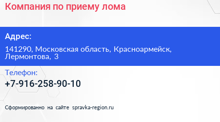 Компания по приему лома по адресу 141290, Московская область, Красноармейск, Лермонтова, 3 в дальнейшем Организация, размещена в следующих категориях: