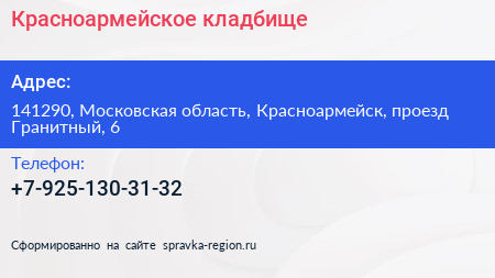 Красноармейское кладбище по адресу 141290, Московская область, Красноармейск, проезд Гранитный, 6 в дальнейшем Организация, размещена в следующих категориях: