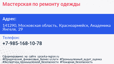 Мастерская по ремонту одежды по адресу 141290, Московская область, Красноармейск, Академика Янгеля, 29 в дальнейшем Организация, размещена в следующих категориях: