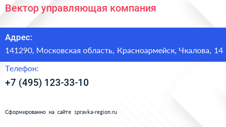 Вектор, управляющая компания по адресу 141290, Московская область, Красноармейск, Чкалова, 14 в дальнейшем Организация, размещена в следующих категориях: